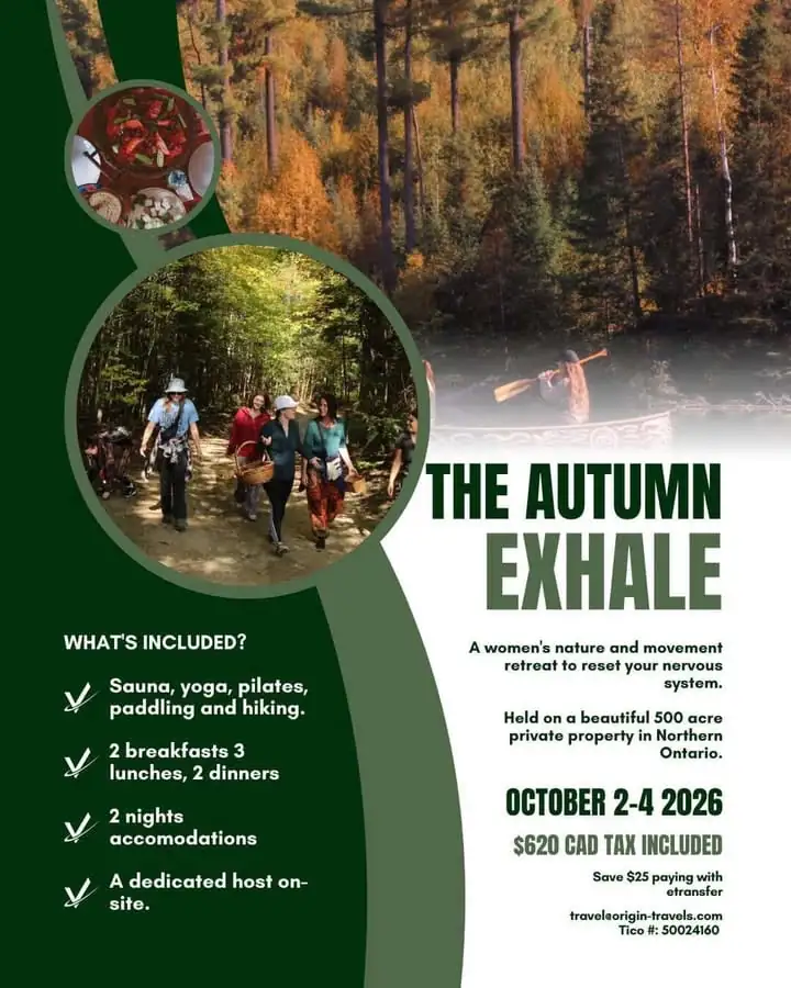 Imagine waking up to crisp fall air and trees painted in amber and fire. Days filled with grounding yoga and energizing Pilates. Afternoons paddling across still water or hiking quiet trails on a breathtaking remote property. Evenings gathered around the table for nourishing, chef-crafted meals and meaningful conversation that lingers long after dessert.